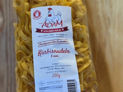 Sie erhalten handgemachte Eiernudeln mit frischem Kürbisanteil. Die Nudeln bringen eine warme Farbe und einen milden Kürbisgeschmack auf Ihren Teller. Die Struktur bleibt beim Kochen stabil und liefert eine angenehme Bissfestigkeit.